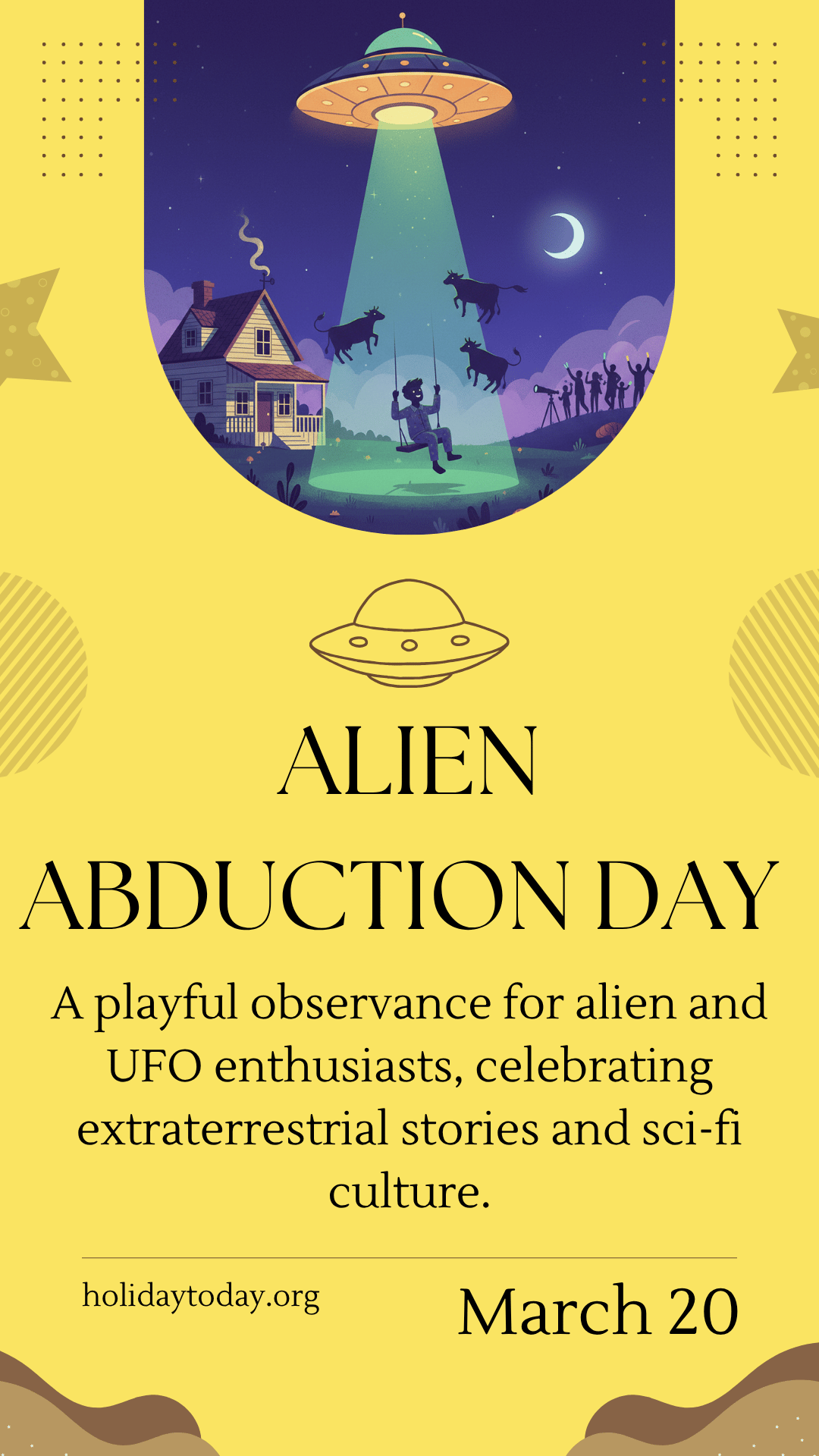 A playful tribute to extraterrestrial lore, dedicated to the themes of alien abductions and UFOs. Sci-fi fans and UFO enthusiasts mark the day with stories, theories, and cosmic humor.